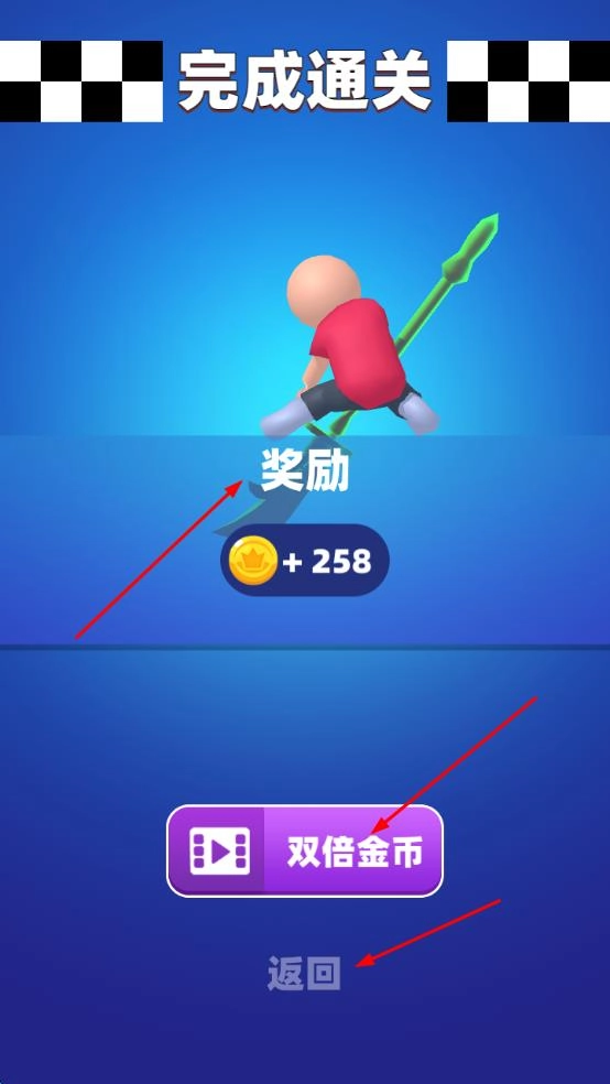 通关后能领取金币奖励,你可以选择观看广告来获取双倍收益,也可以点击返回,总结经验后开启新关卡,不断积累财富。