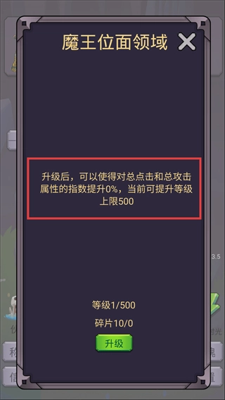 2、进入【魔王位面领域】后,升级能够提高总点击与总攻击属性,该领域等级上限为【500】,推荐优先进行升级来强化战斗输出能力。