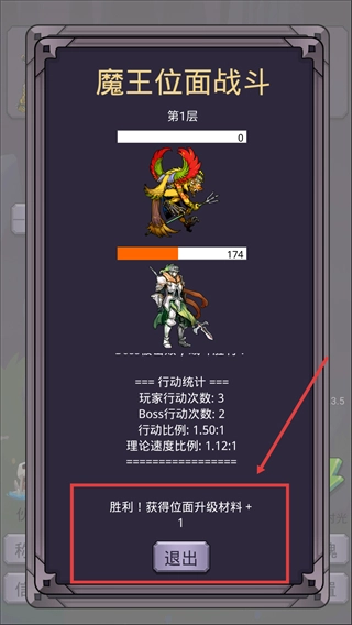 4、战斗获胜后可获取【位面升级材料】,点击【退出】按钮返回界面,使用该材料对位面进行升级,以此持续提升整体战斗能力。
