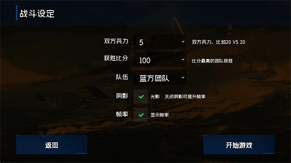 4、手动调整双方兵力、获胜比分、所在队伍阵营等设置,随后点击开始游戏;