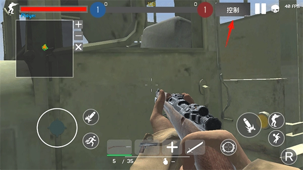 7、进入游戏后,可通过左侧摇杆操控角色移动,滑动屏幕来调整方向;右侧按钮从左至右分别对应瞄准、开火、站立/下蹲切换、跳跃以及换弹功能...