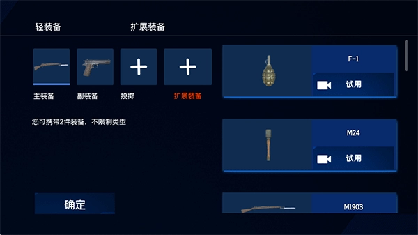 5、扩展装备配置:挑选主武器、副武器、投掷武器及其他扩展类装备,全部选定后点击确定按钮;