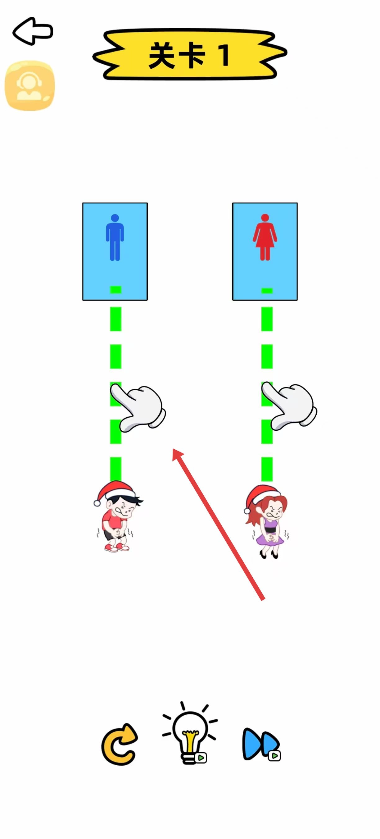 在第一关的场景里,能看到男、女厕所的标识以及对应的性别小人。按照指引沿着绿色虚线,把男孩和男厕所连起来,女孩和女厕所连起来,一定要保证连线准确无误。