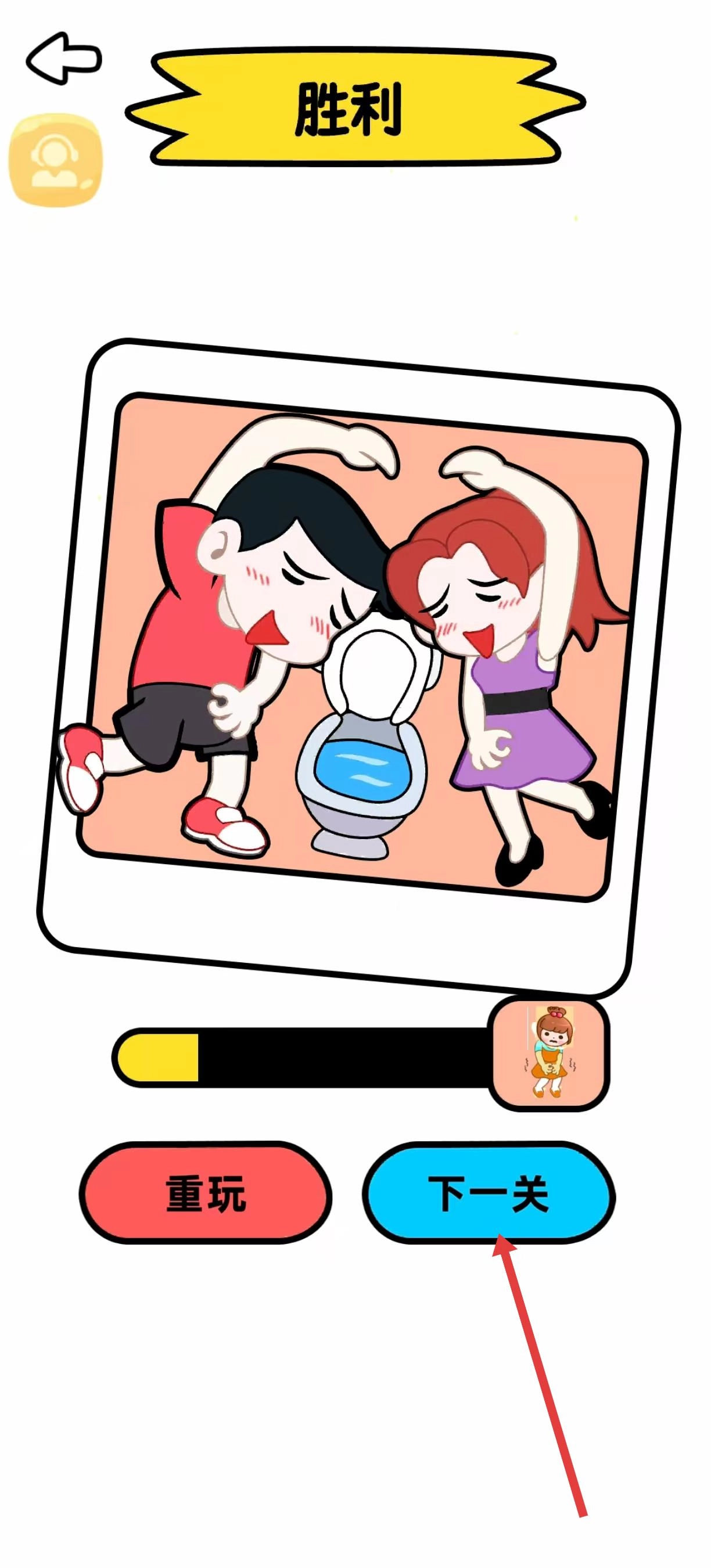 成功引导小人到达对应厕所后,会进入胜利界面,此时点击蓝色的下一关按钮,就能继续挑战新关卡,体验更多连线带来的乐趣。