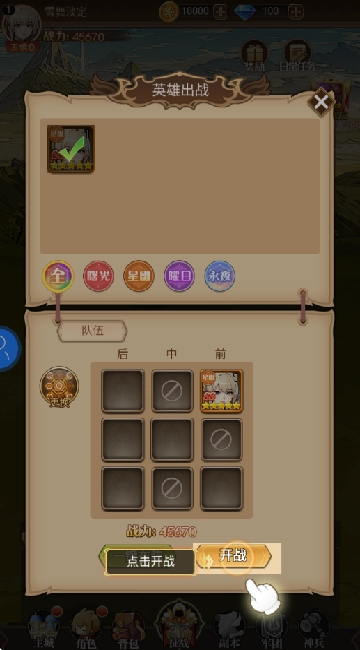 3、设置好英雄出战阵容后,点击下方的“开战”按钮即可;不过前期可使用的英雄数量相对较少。