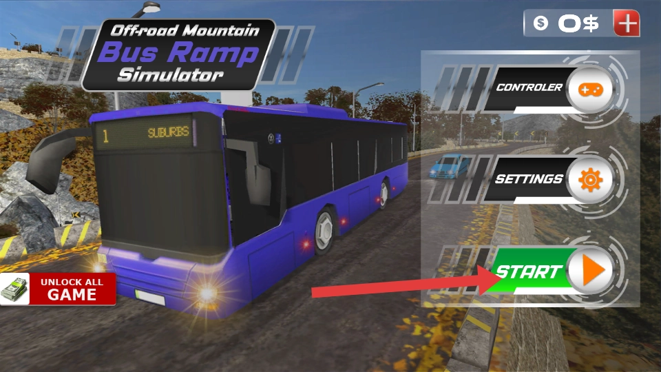 打开山坡巴士模拟器后,首先看到的是主界面,右侧那个绿色的START按钮就是启动键,点击它便能开启巴士山地驾驶之旅,操控巴士在崎岖的山路上行驶,尽情体验模拟驾驶的乐趣。