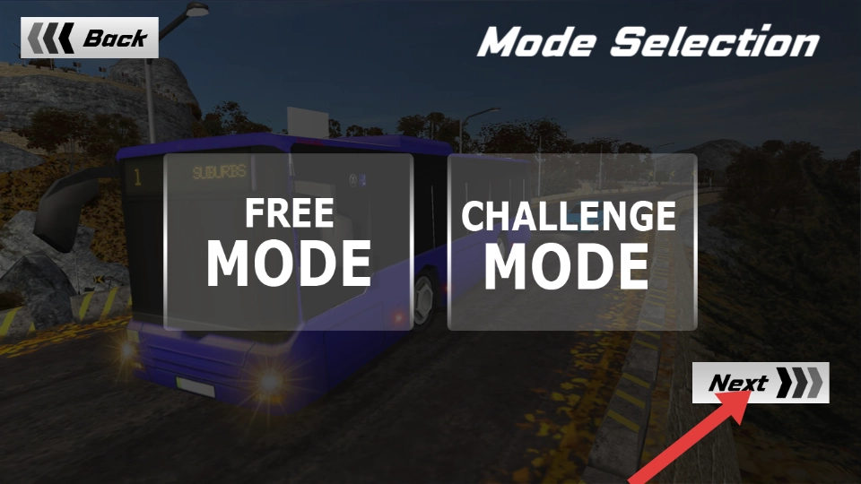 模式选择界面包含FREE MODE与CHALLENGE MODE两种选项,选定后点击Next即可进入;自由模式支持随心驾驶以熟悉操作,挑战模式则设有任务目标,您可依据个人喜好开启巴士驾驶的旅程。