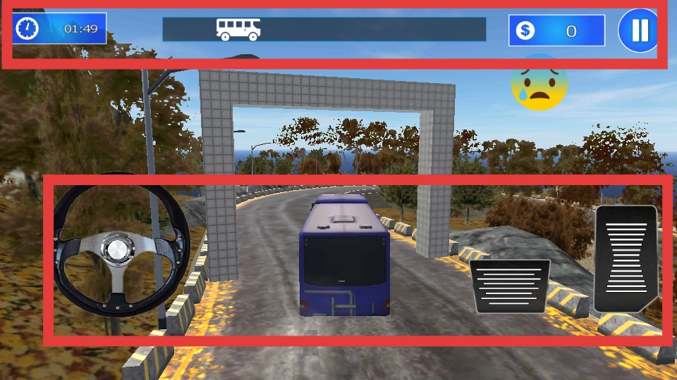 驾驶界面的下方区域为操控区,左侧的方向盘负责控制车辆的行驶方向,右侧的踏板则用于操控加速与刹车;界面上方的红框内会显示时间、任务进度以及金币等相关信息,而金币需要通过完成各类挑战来获取。