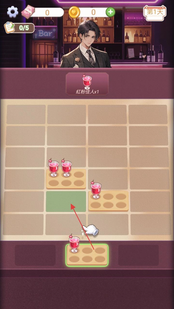 继续开展饮品摆放工作,把下方新出现的饮品,依据提示移动到恰当的位置,让饮品排列更为整齐,完成这一环节,推动酒吧经营的游戏进度。