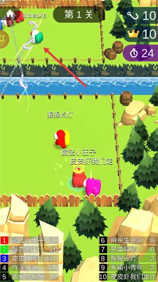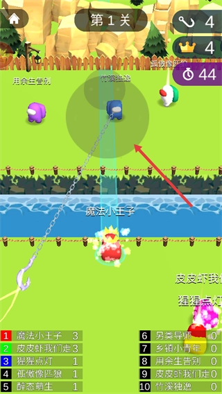 1. 核心操作流程为:点击屏幕进行蓄力,同时滑动屏幕选定发射角度,松开手指后,你的角色便会朝着对岸甩出钩索,尝试将对手捕获。