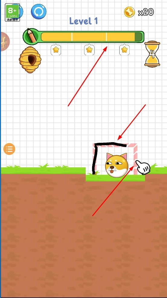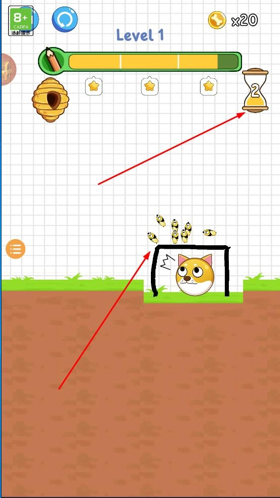 在关卡中,你需要用画笔为小狗绘制围栏来阻挡蜜蜂,同时要留意上方的进度条和沙漏计时,合理规划防线。