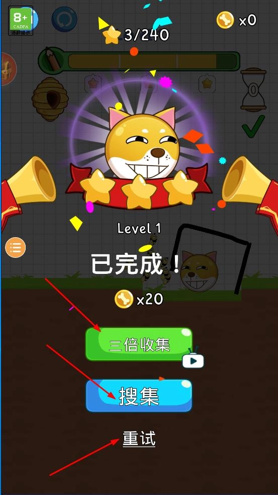 通关后点击“搜集”按钮就能领取金币,要是想看广告还能获得三倍奖励;要是挑战失败了,选择“重试”就能重新挑战这一关卡。