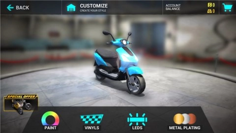在主界面点击“CUSTOMIZE”按钮,即可进入摩托车的改装界面。