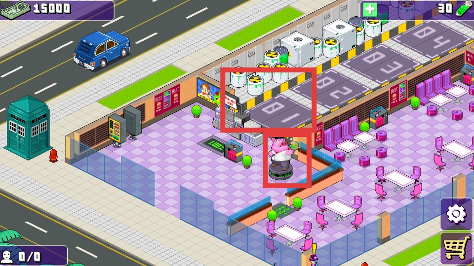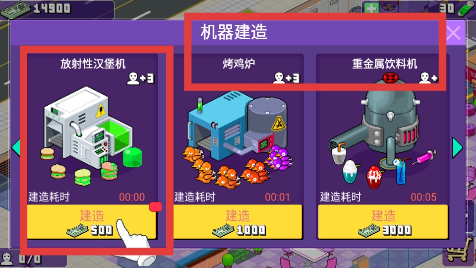 在游戏的初始界面,点击“继续”按钮就能进入游戏;接着点击建造按钮,消耗相应数量的金币,就可以打造出像放射性汉堡机这类机器,它们能帮助提高餐厅的制作效率。