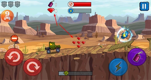 1、在游戏场景里操控车辆行驶,收集钻石类资源,不断积累其数量,以此为游戏的推进提供助力。