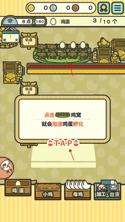 3、现在进入第一个环节:母鸡生蛋。观察鸡窝中的母鸡数量,通过不断点击加速鸡蛋的生成速度。