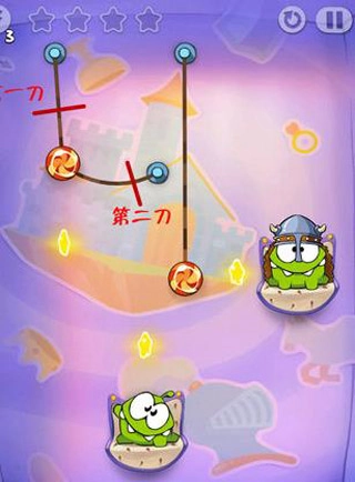 第一关是教学关卡,没有难度,只需先割掉第一条绳子,再割掉另一条就可以了。