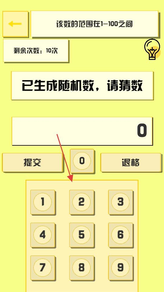 进入猜数主界面后,先确认好数字范围,再按照红色箭头的指示,用数字键盘输入你猜测的数值,最后点击提交按钮参与游戏。