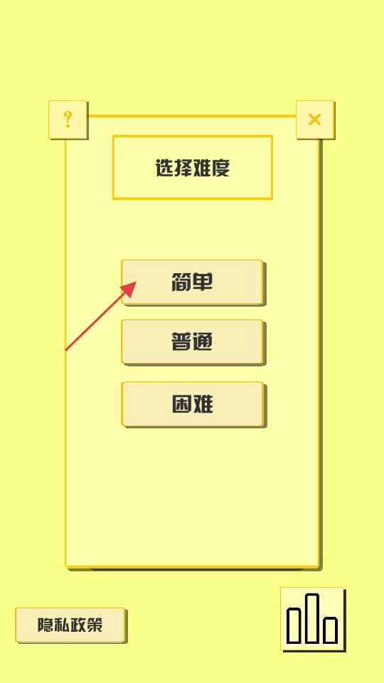 进入难度选择界面后,会显示简单、普通、困难三个选项,按照红色箭头的提示,点击“简单”选项,即可确定游戏的难度模式。