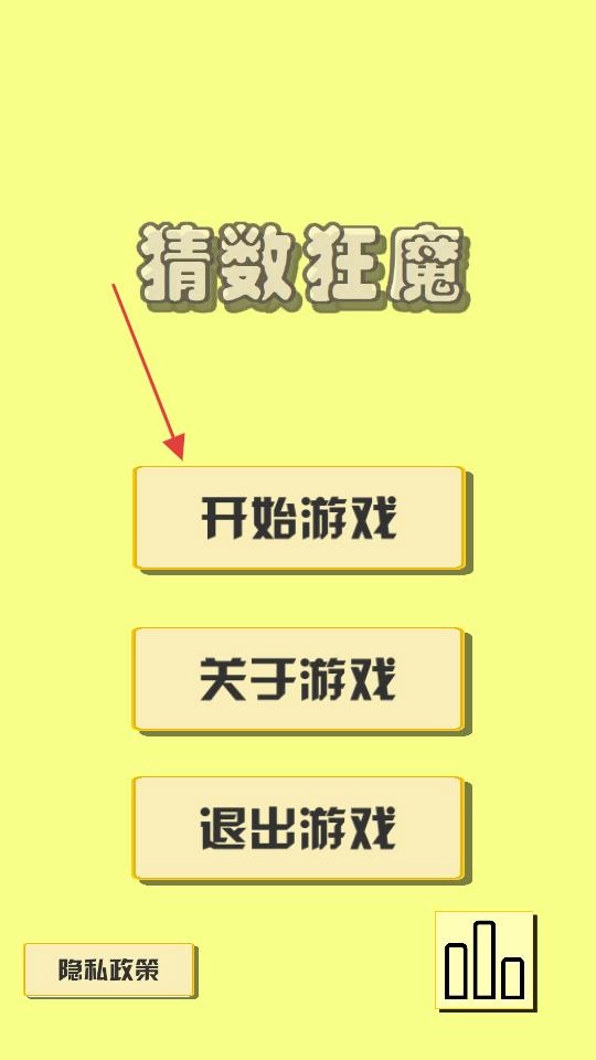 进入游戏初始界面后,能看到“开始游戏”“关于游戏”“退出游戏”这几个选项,按照红色箭头所指的方向点击“开始游戏”,就能开启猜数挑战的进程。