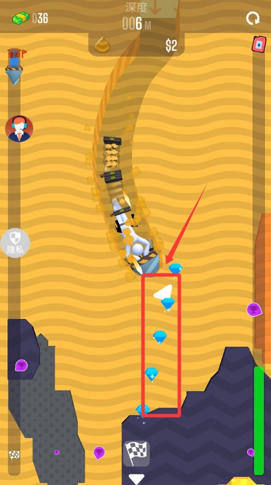 在游戏中,玩家需操控钻机,优先对发光的钻石矿脉进行采集——每颗钻石都能带来高额积分;不过要注意避开坚硬的岩石层,防止钻头的耐久度受损。