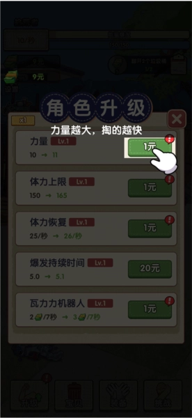 2. 点击屏幕左下角的【升级】功能,花费金币来提升角色的【力量】、【体力上限】等属性。完成升级后,能够提高翻找效率和行动力。