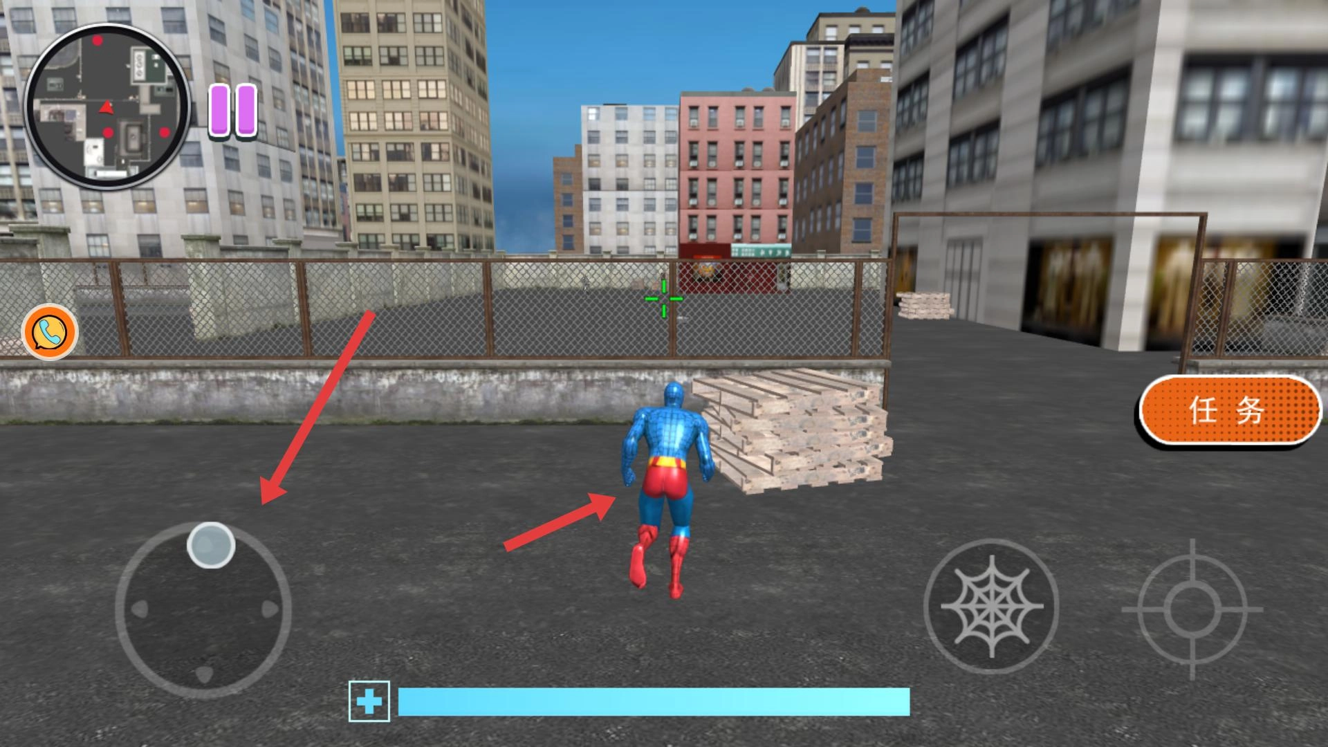 基础移动操作指南:用单指滑动来调整角色的移动方向,长按屏幕即可让角色进入快速奔跑状态。当角色靠近建筑物边缘时,系统会自动启动攀爬动作;若想从高空飞跃,只需双击跳跃键并结合蛛丝功能就能实现。