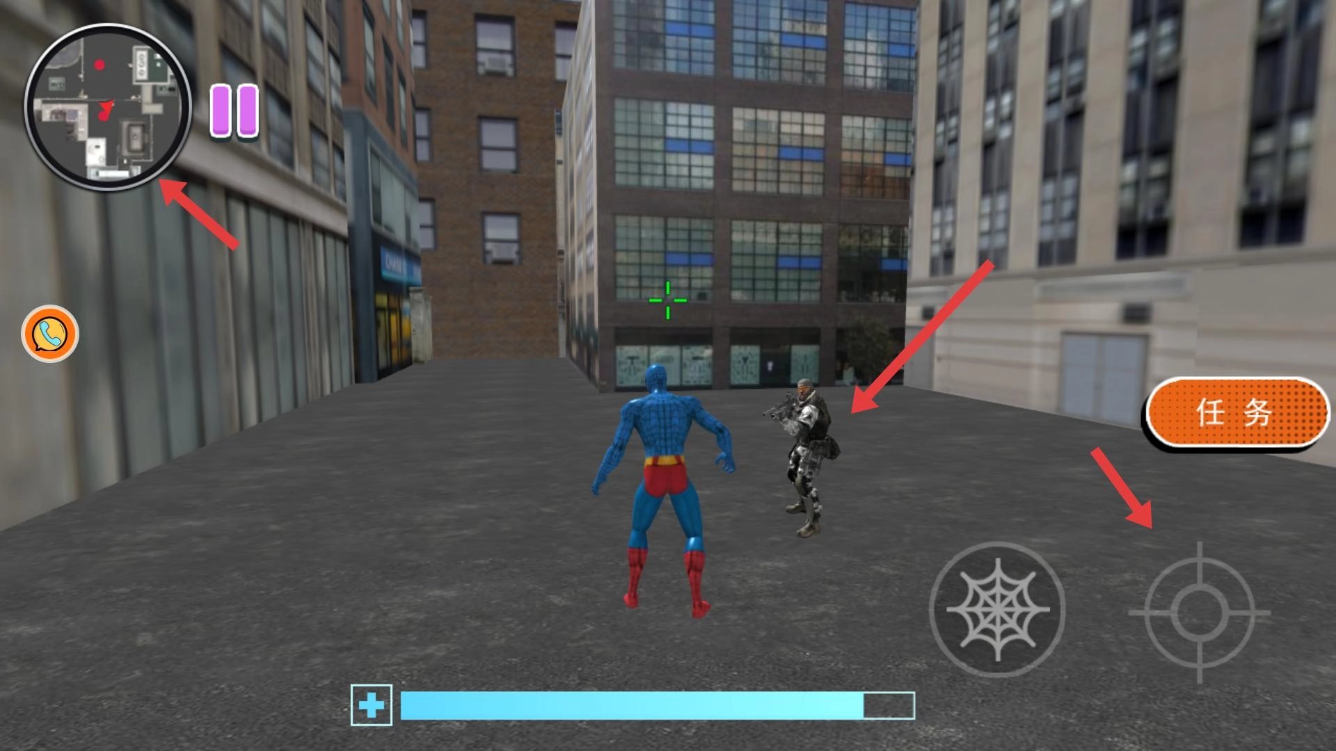 遇到敌人时,先通过小地图确定其位置,再使用蛛网技能发起攻击,同时搭配射击按钮进行操作,以此完成战斗;之后按照任务指引,继续推进冒险进程。