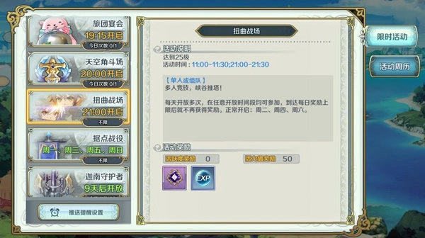 扭曲战场每周二、周四、周六会限时开放,早晚时段都能参与哦~每个时段可参与一次,而且每天首次参与的奖励会翻倍呢。