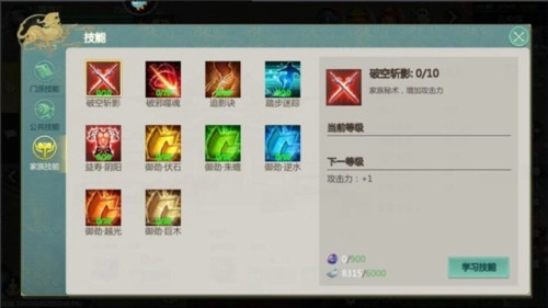 4、获取奖励后还可以在技能坊学习和提升家族技能