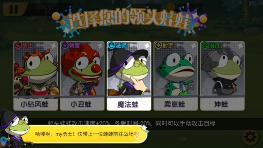 1、挑选一只蛙蛙,每种蛙蛙都拥有独特属性,决定了战斗方式和成长方向。