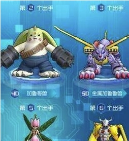 阵容组合建议:梗犬兽、加鲁哥兽、花仙兽,再搭配3只输出型数码宝贝——我选的是战斗暴龙兽、金属加鲁鲁兽和终极巨龙兽。