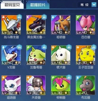 培养数码宝贝最基础的方式是提升它的等级。通过召唤,能获得不同稀有度的1级数码宝贝。它的各项属性数值会随着等级的提升而增加。当数码宝贝达到特定等级时,要通过升星来提高等级上限,之后再继续升级。给数码宝贝喂食就能提升它的等级。不同属性的数码宝贝需要使用对应属性的专属食物,不过也存在一些通用食物可以供给所有属性的数码宝贝食用。