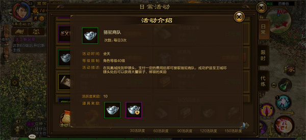 骆驼商队任务同样是我们获取资源的重要途径,等级超过40级的玩家每天都能参与3次拉骆驼任务。大家只需前往凤凰城找到甲镖头领取骆驼,再按照任务指引就能顺利完成任务。完成后可获得不少不绑定绑银和绑定绑银,不过拉骆驼时最好有人同行,毕竟其他国家的玩家可能会为了这些绑银来攻击骆驼,保护好自己的骆驼是首要任务。
