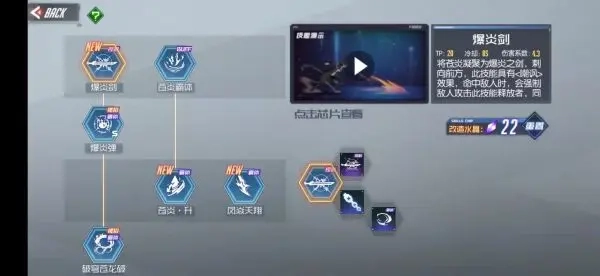 苍炎的技能大致可分为两类:一类是用于给目标施加燃烧效果的技能,这类多为冷却时间较短的小技能,伤害量不高;另一类则是针对处于燃烧状态的目标时会触发额外特效的技能,这类通常是冷却较长的大技能,也是主要的伤害输出手段。部分技能在生效时可能会直接消耗目标身上的燃烧状态以换取更高额的伤害,但这也使得苍炎仅携带一个挂燃烧的技能远远不够——尤其是对于连锁芯片数量较少的苍炎而言,若携带两个挂燃烧技能,又会占用过多的技能槽位。