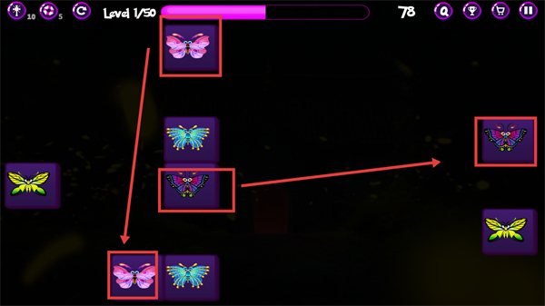 3、继续推进关卡,锁定红色框选的同类型蝴蝶进行配对,得分提升到【78】,加快节奏推进消除进度。