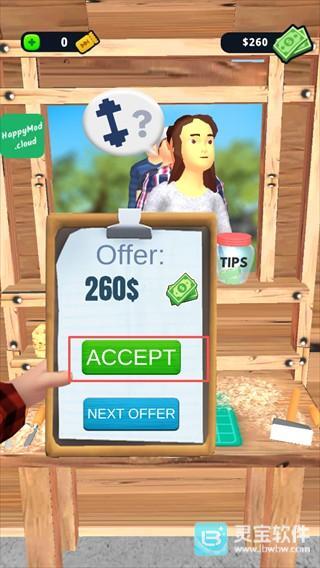 点击【ACCEPT】按钮以接受这笔260美元的哑铃制作订单,并明确本次制作的目标样式。