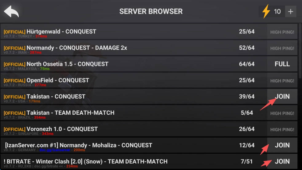 3、在里面找到能够加入的对局,优先选择延迟较低的,接着点击对局右边对应的“JOIN”按钮加入该局;若延迟过高或者对局已经满人,则无法成功加入。