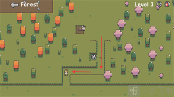 4. 在【Level3】的后续阶段,请沿着红色箭头指示的方向前进,途中绕过树木与围栏,最终抵达指定的目标位置,即可完成本关卡的推进。