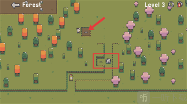 3. 进入【Level3】后,移动到箭头所指的棕色区域来触发机关,使方框内的石头发生移动,以确保道路畅通。