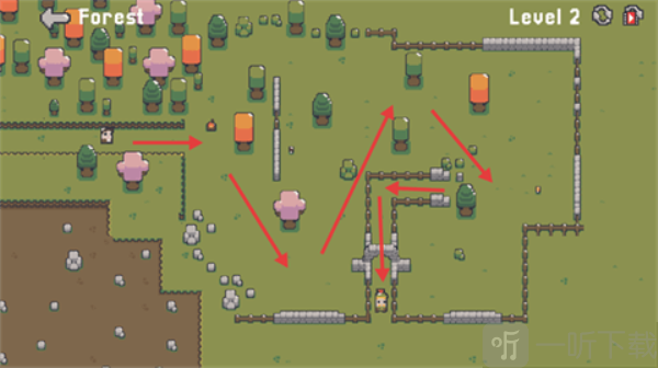 2. 进入【Level2】后,沿着箭头指示的路径穿过树林与石墙区域,途经火焰和树木,朝着目标所在的方向继续前进。