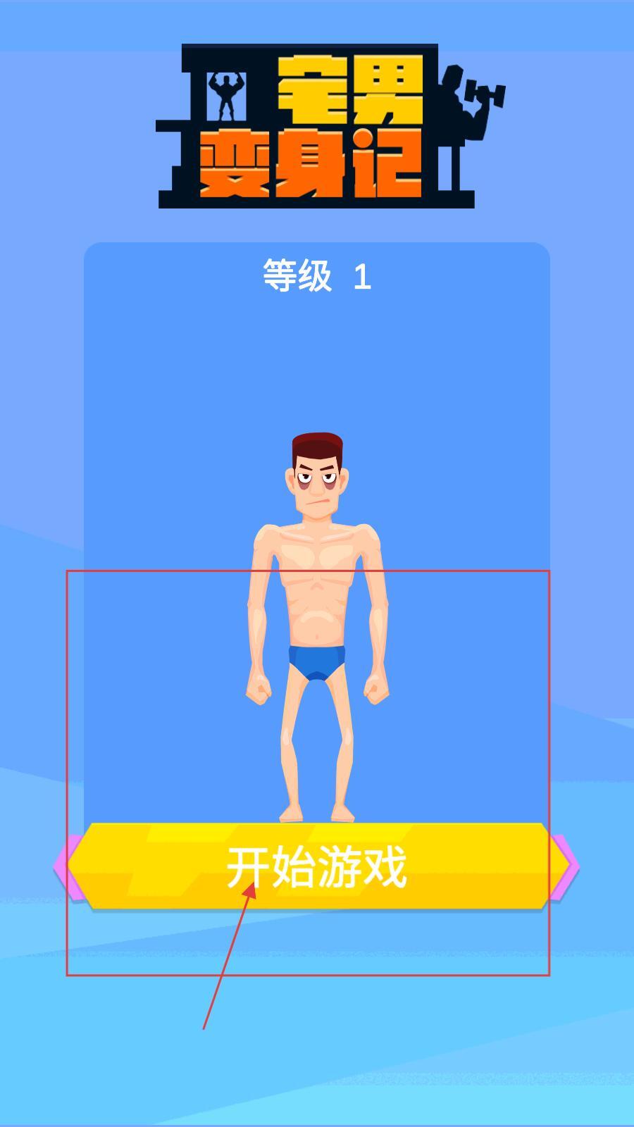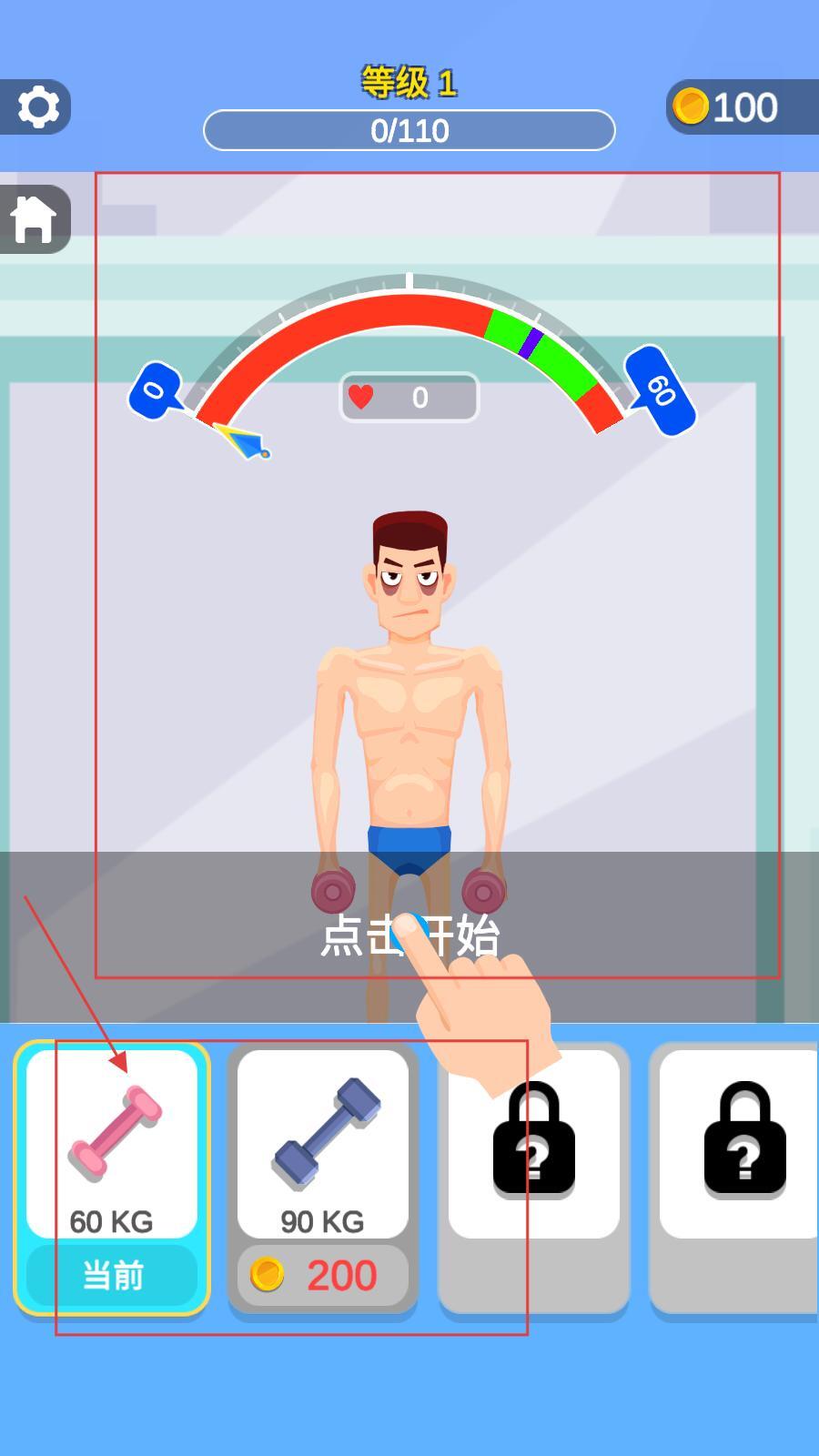 1、点击【开始游戏】进入等级1,挑选合适的哑铃,按照提示点击开始健身,以此提升角色的肌肉值。