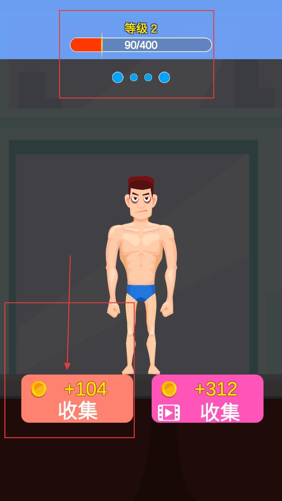 3、玩家等级提升至2级后,点击【收集】按钮领取金币,使用金币购买新装备,持续通过健身强化角色,推进养成进度。