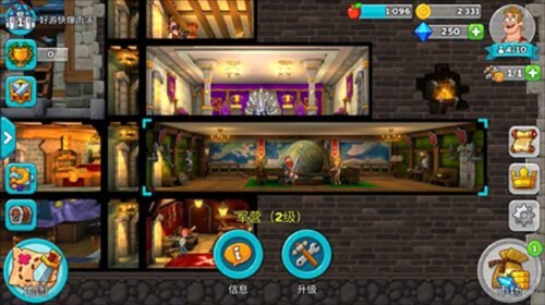 2、和多数建造类游戏的机制类似,本作里要升级各类基础设施,得先把主建筑的等级提上去——具体来说,就是要先升级王国大殿,才能升级军营。升级王国大殿后,系统还会解锁新的可建造建筑,像餐厅、宝库、居住室这些都包含在内。在喧闹的城堡游戏中,宝库的作用是持续产出金币并提高金币获取效率,金库则专门用来储存金币;宝库等级越高,金币的获取速度就越快,而金库等级越高,能储存的金币上限也就越大。同理,餐厅是负责产出苹果等消耗品的设施,提升它的等级同样能加快这些消耗品的获取速度。