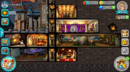 4、我们还能点击城堡里的角色,把背包中的装备给他们穿戴,不过要留意,部分特殊装备只能给特定角色佩戴。像铠甲仅能给坦克穿、法杖只能给法师用这类,并且这些装备都能有效提升对应特殊角色的属性。等资金充足时,可点击右下角的市场来添加新房间。我们能建造的房间类型有生产类、训练类、支援类、宝藏类、混杂类等。
