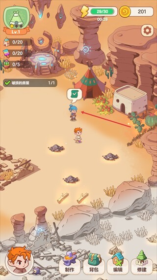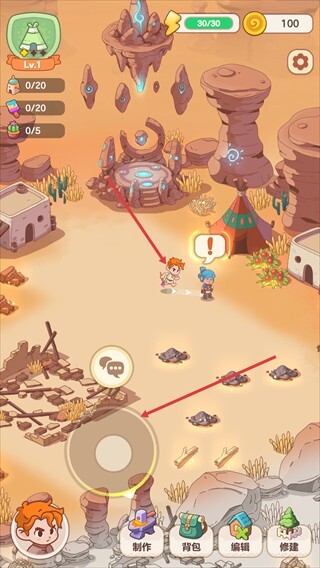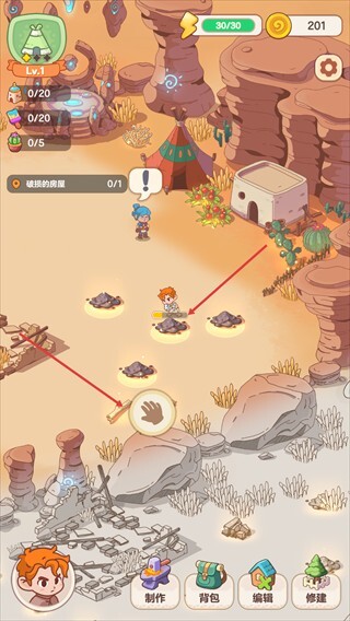 3. 生产与建设:点击“制作”按钮,利用资源制造材料;站在废墟附近时,点击“锤击”按钮即可修复建筑。