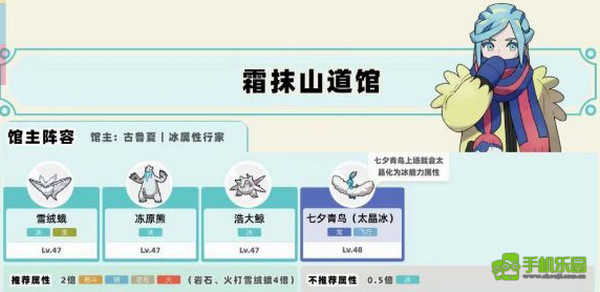 霜染山峦的冰系道馆馆主古鲁夏!这可是最后一座道馆啦,你完全可以先放一放不着急挑战,不如先四处逛逛练练级——毕竟现在到处都能碰到火系宝可梦,随便抓只卡蒂狗,用火焰石让它进化后,就能完美压制古鲁夏了!