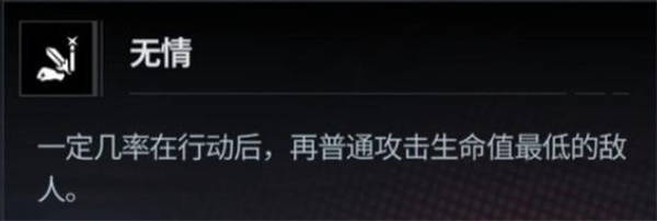 1、无情:行动结束后,有概率对当前生命值最低的敌人追加一次普通攻击(该效果为吕太洲被动技能专属)。