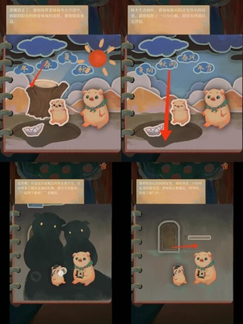 把小猪挪到别的地方,用水桶把壁炉里的火浇灭,就能拿到故事书,书里写着“春去秋来,年复一年”