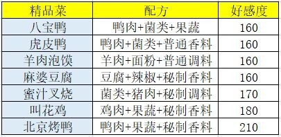 3、当然凡事也有例外,一是蜜汁叉烧,增加170好感度但消耗90元宝,比同样消耗90元宝的叫花鸡少10点好感度;二是北京烤鸭,增加210好感度且消耗110元宝,按正常算法本应增加220好感度。